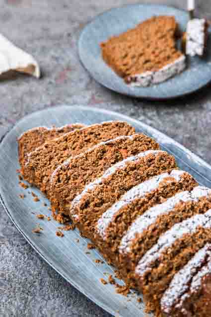 Ich habe mich dieses Mal dazu entschieden den Kuchen wirklich ganz „basic“ zu lassen und nicht noch ein veganes Frischkäsefrosting, Schokoglasur oder sonstiges auf dem Kuchen zu verteilen. Stattdessen habe ich ihn einfach mit etwas Puderzucker bestreut und genauso hat er uns auch am besten geschmeckt. Ihr seid aber natürlich total flexibel und könnt den Kuchen ganz nach euren Vorlieben dekorieren.