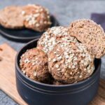 Mit feuchten Händen den Teig in 7 Portionen aufteilen & mit etwas Reismehl zu Brötchen zurecht formen. Die Brötchen mit etwas Wasser bepinseln und mit glutenfreien Haferflocken bestreuen.